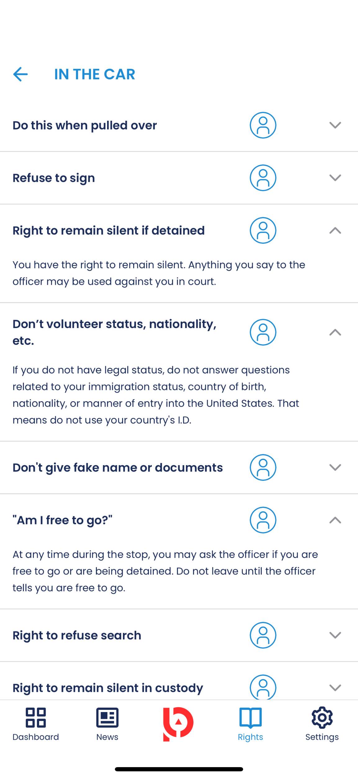The app explains immigration rights in a clear, easy-to-understand way, so you know what you can and cannot do in real situations.